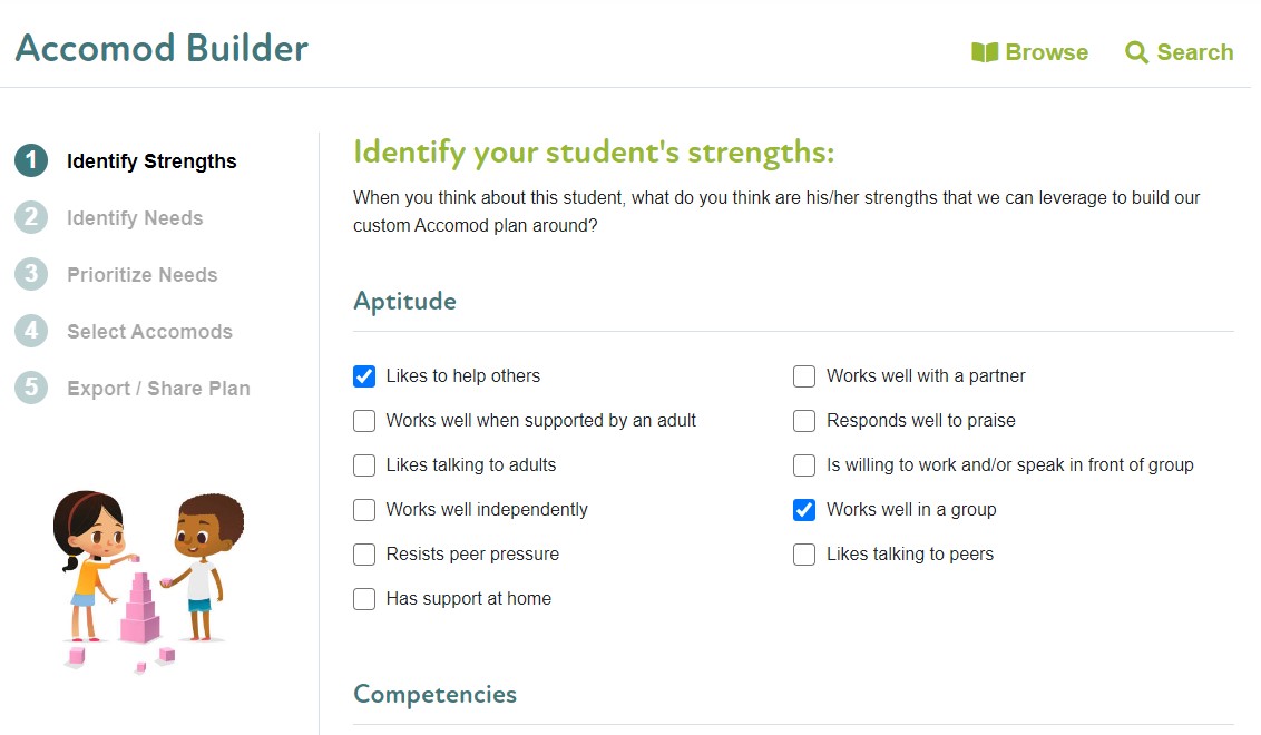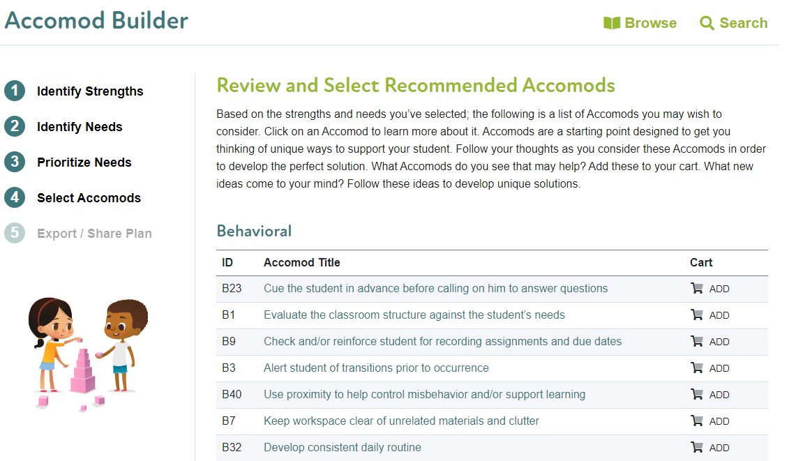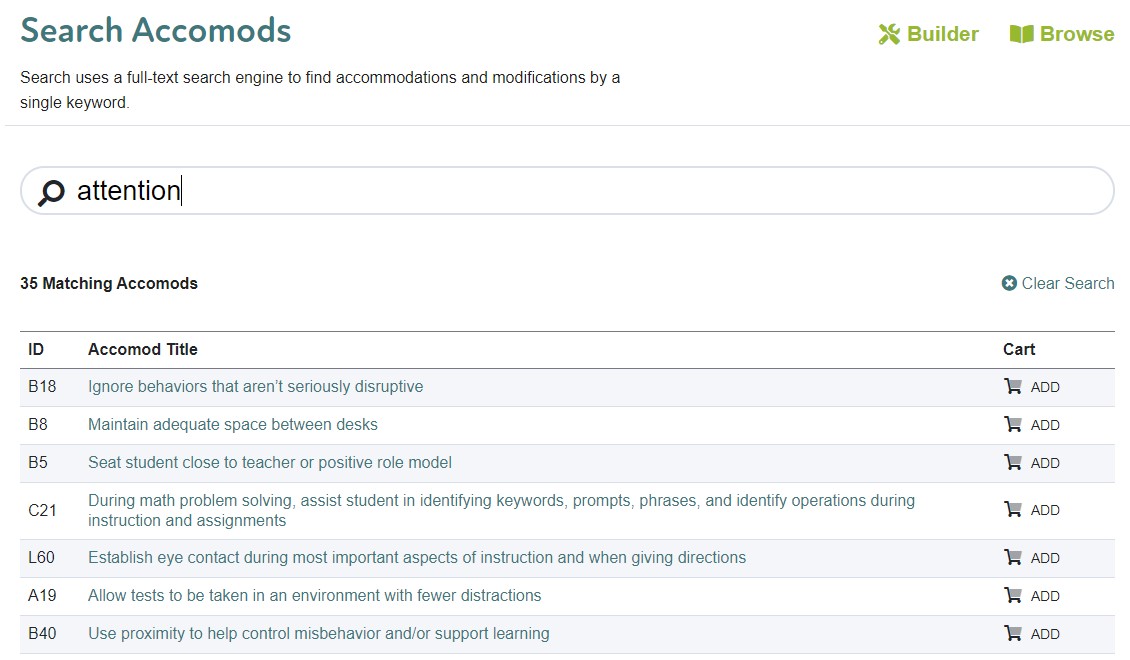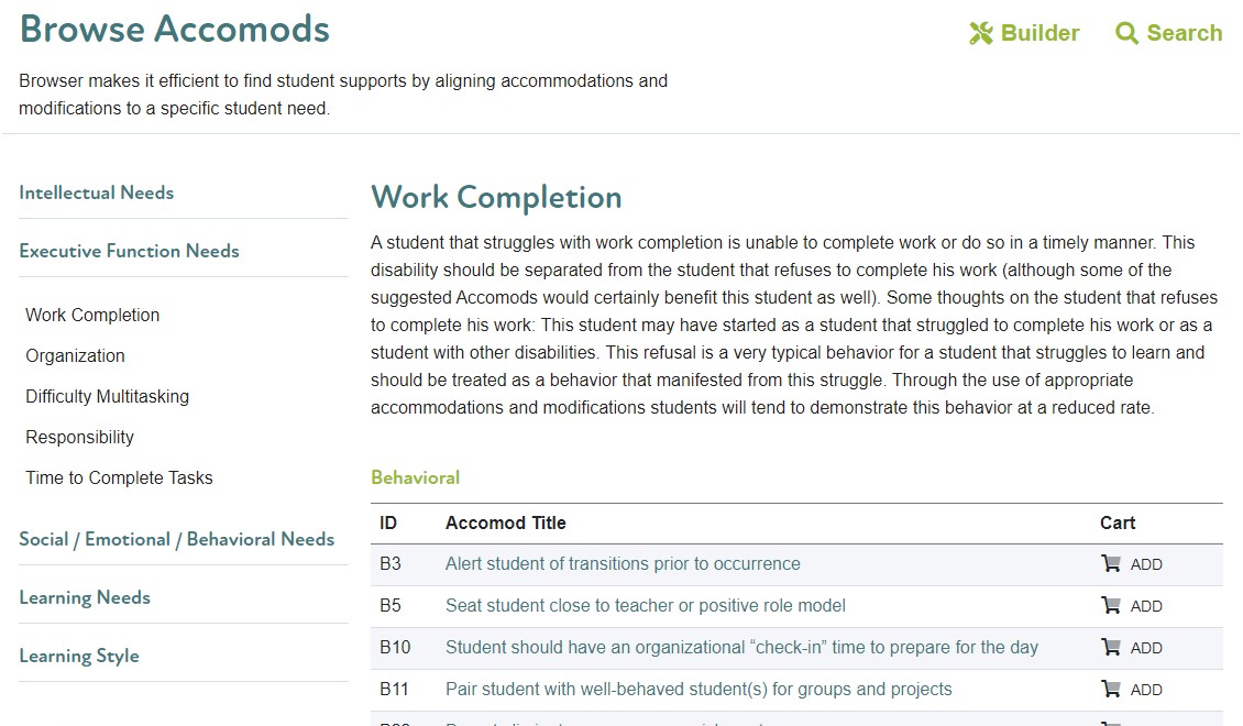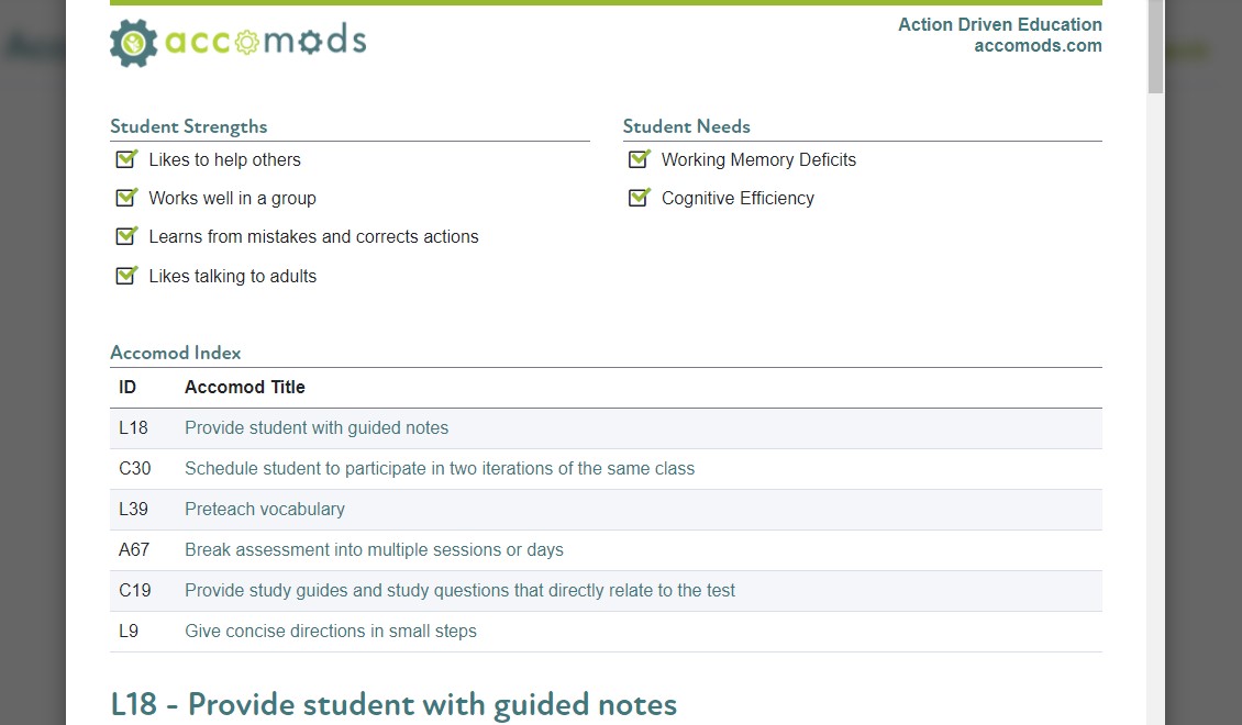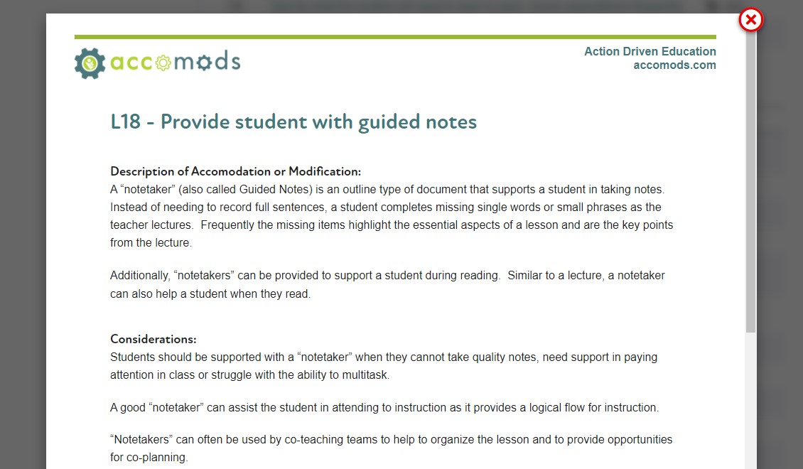 Accomods efficiently engages IEP teams in critical thinking activities to analyze and design appropriate inclusive learning environments for all students. By providing access to hundreds of detailed accommodations and modifications, teachers are empowered to develop and implement the individualized support necessary to meet the special needs of learners from pre-referral through those identified with special needs.