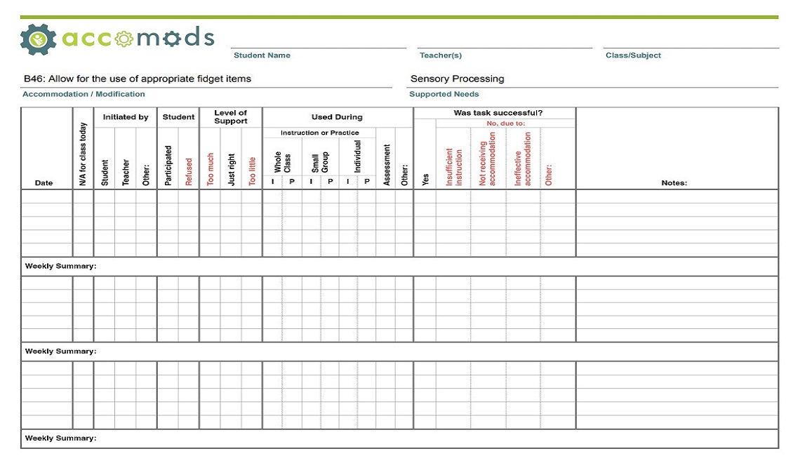 • Detailed descriptions of adaptations used to support a student around a learning or behavioral need, categorized by needs and aligned to student strengths