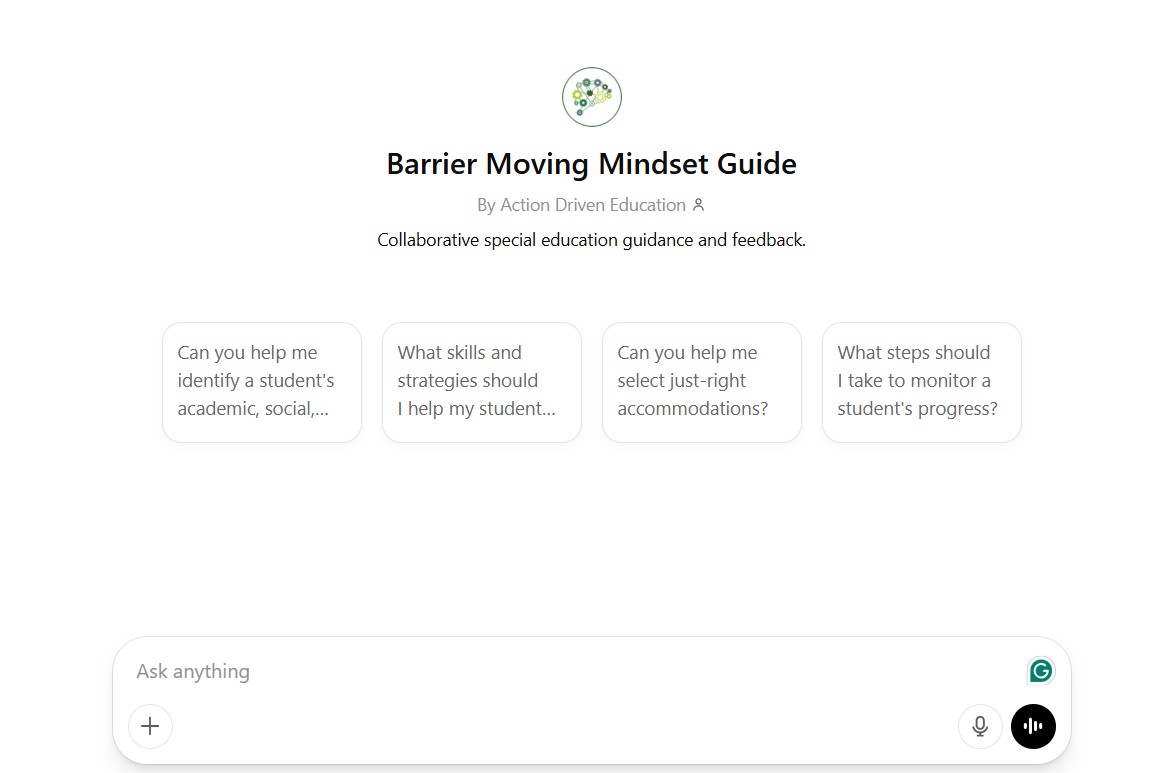 The Barrier Moving Mindset GPT helps educators adopt a builder-focused approach to overcoming learning barriers by identifying skill gaps and developing goals that help improve a learner’s barrier-related skills. This amazing work of Artificial Intelligence prioritizes action over theory, guiding users to design practical solutions that empower student progress. With a no-fluff, toolbelt-style tone, it transforms mindset into movement—shifting focus from what’s wrong to what’s next.